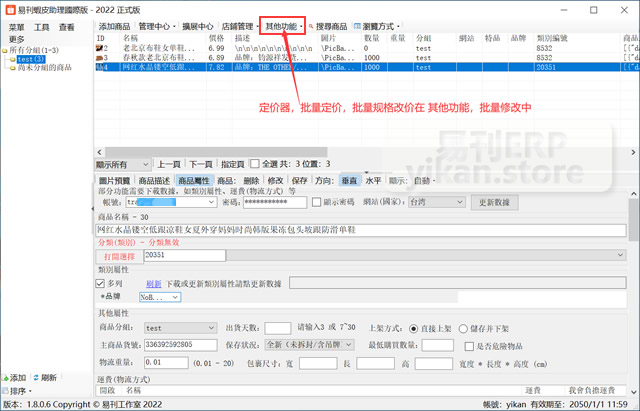 商品批量采集下来以后,一般会有修改价格的需求,特别是批量修改定价。在易刊软件上找到【其他功能】,点击【批量修改】就能找到定价器来批量定价或修改价格,如下图: