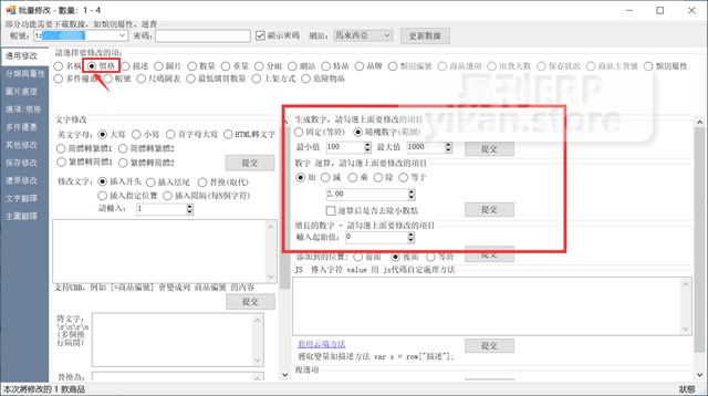 在【通用修改】区选择【价格】,在右侧可以选择符合自己要求的方式来修改价格,如从最小值到最大值的随机数字、统一加减乘除一个数等,如下图: