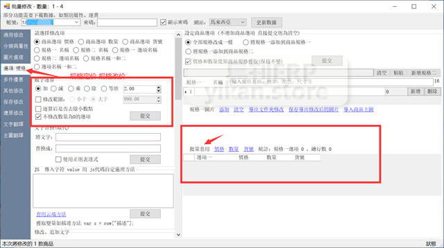 如果要修改规格定价,规格改价,在左侧点击【选项/规格】,设置好之后提交,也可以批量套用价格、数量、货号等,如下图: