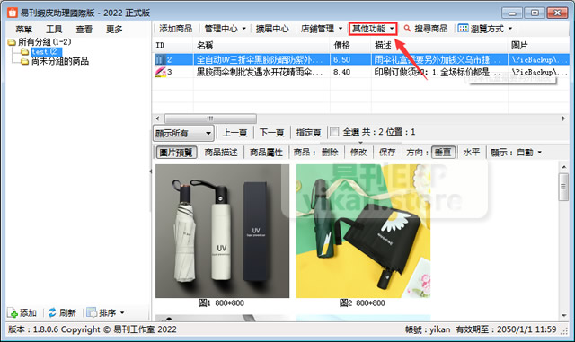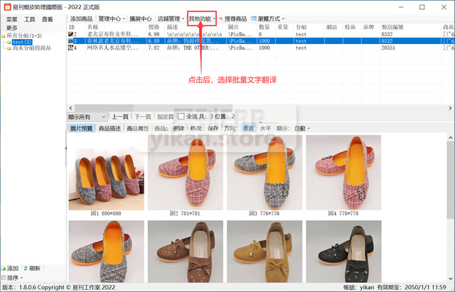 当涉及到商品语言需要让易刊软件自动翻译为目标语言的时候,在易刊软件上找到【其他功能】,在下拉菜单中选择【批量文字翻译】,如下图: