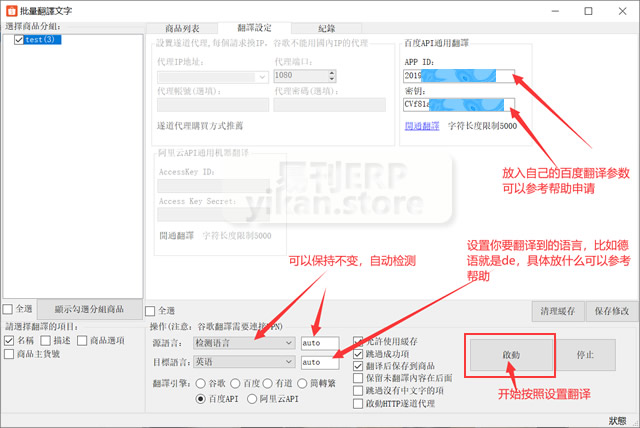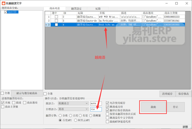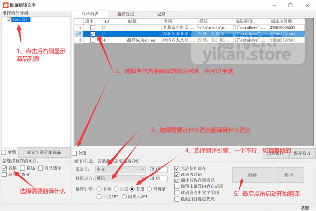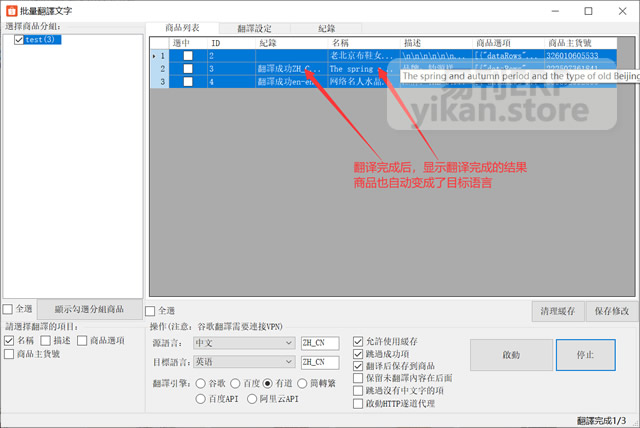 1、点击商品分组后在右侧会显示出商品列表;2、选择需要翻译的商品,也可以全选;3、选择需要从什么语言翻译到什么语言;4、选择翻译引擎,一个不行,就切换其他的;5、最后点击【启动】开始翻译,如下图: