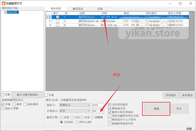 设置好之后,选中需要翻译的商品,翻译为韩语,就选择“韩语”,后面写“kor”,再点击右侧【启动】开始翻译,如下图: