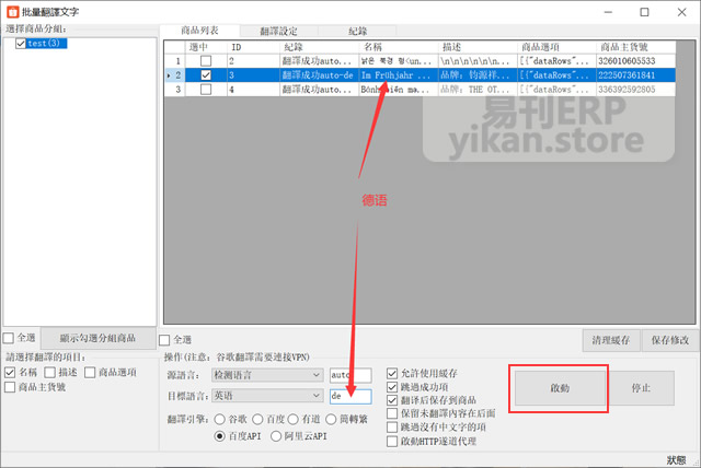 目标语言如果是德语,就选择德语,后面写“de”,再点击右侧【启动】开始翻译,如下图:
